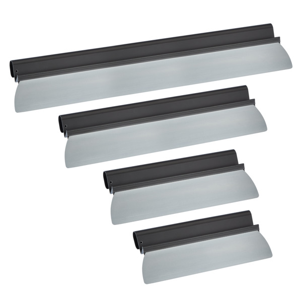 Ergonomisches Aluminiumprofil, pulverbeschichtet mit wechselbarem Edelstahlblatt 0,3 mm stark und 9 cm breit. Klingenblatt für ansatzlose Spachtelungen in den Ecken leicht abgerundet. Breite: 30, 40, 60, 80 oder 100 cm.