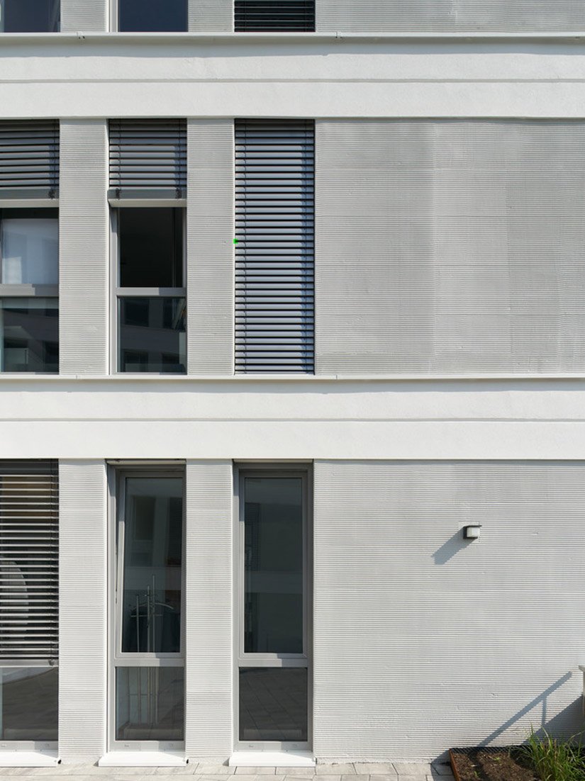 Die Herausforderung bestand darin, eine langlebige und zeitgemäße Fassade zu gestalten, die auch in Zukunft gut aussieht und funktioniert. Glatte Brüstungs- und Sturzflächen wechseln sich mit Pfeilern ab, die durch Putz mit Kammstruktur einen eleganten Schattenschlag erzeugen. Die dunklen Fenster verstärken die gewünschte Bänderoptik. So gelang ein fließender Übergang zwischen Aluminium- und WDVS-Fassade.