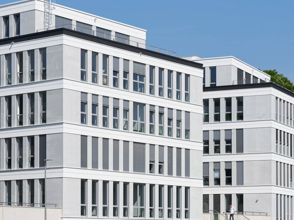 Die Fassade des viergeschossigen Gebäudes, ergänzt durch ein Staffelgeschoss, kombiniert zu einem Drittel eine Aluminium-Glas-Fassade und zu zwei Dritteln eine WDVS-Fassade mit Fenstern. Da eine durchgängige Aluminiumfassade aus Kostengründen nicht möglich war, wurde eine Hybrid-Fassade gewählt, die gestalterische und bauphysikalische Vorteile vereint, ohne wie ein Kompromiss zu wirken.