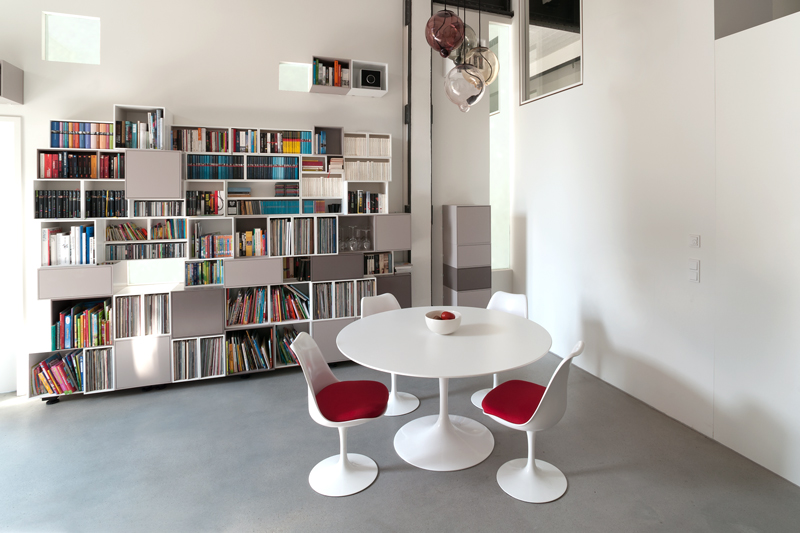 Wie eine Skulptur steht dieses mattschwarze Stahlgebilde im Raum. Die vertikale Erschließung bildet den Mittelpunkt des Raums und fängt den Blick des Betrachters ein. Funktionen der umgebenden Räume formieren sich locker und unaufgeregt um diese schwarze Achse.