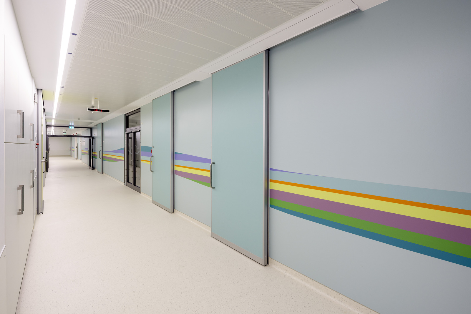 In der Rhein-Mosel-Fachklinik in Andernach kam das 2K-PU-Finish oberhalb des Rammschutzes für die Herstellung einer durchgehend türkisfarbenen Optik zum Einsatz – verarbeitet auf Lightvlies Pro 130. Auch aufgrund der hohen Strapazierfähigkeit fiel die Entscheidung auf das zweikomponentige Produkt.