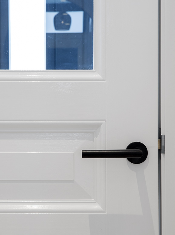 Im Eingangsbereich wird das begrenzte Raumangebot ganz pur gelassen mit schwarz und weißer Lackierung der Türen, dazu kommt ein matter Weißton an den Wänden und Decken.