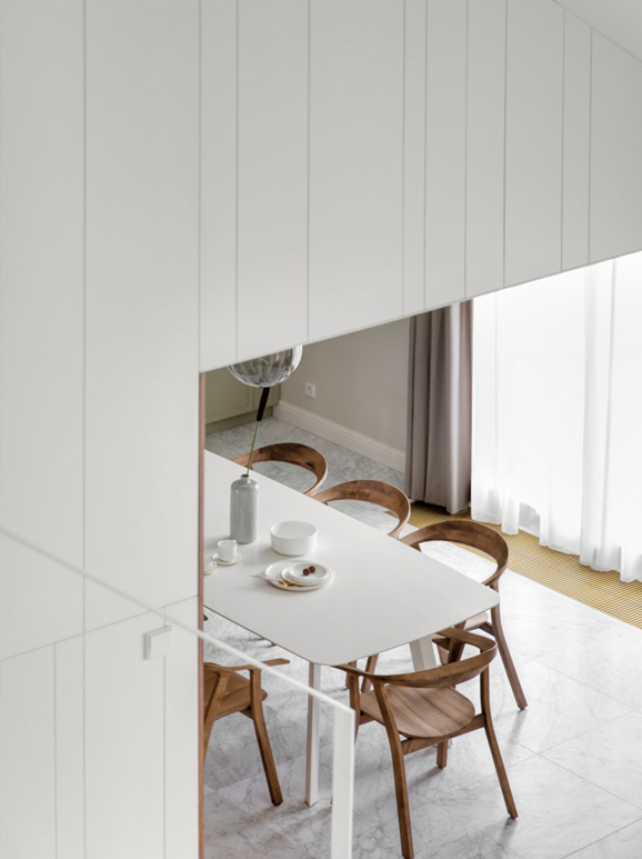 Statt auf Ton-in-Ton wurde auf einen attraktiven Kontrast gesetzt und das warme Weiß mit tiefem Dunkelblau kombiniert. Nicht der einzige Mix in diesem Apartment der Extraklasse.